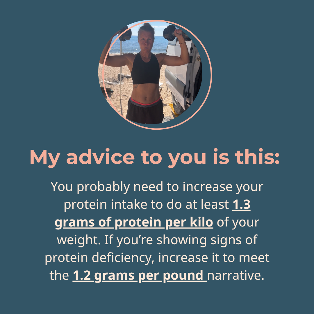 I’ve found it more practical and doable to do 1.4 grams of protein per kilo – so more like 24-30 grams per meal to hit my daily target of 90 grams. Am I deficient in protein? You would know it by seeing muscle wastage (sarcopenia), blood sugar issues, hormonal challenges – which I do NOT experience.