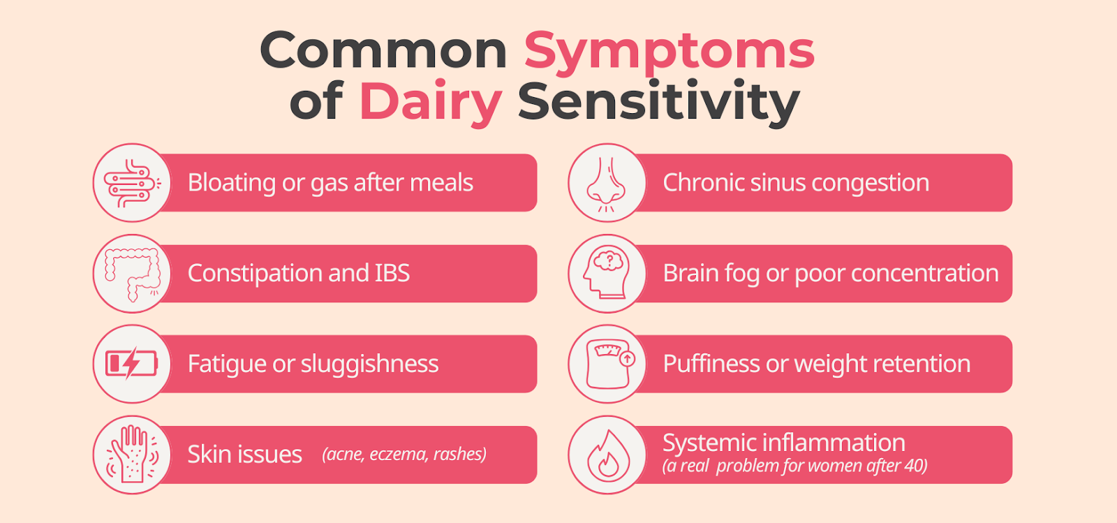 In fact, according to the National Institutes of Health, around 65% of people worldwide have a reduced ability to digest lactose after infancy [NIH, Lactose Intolerance, 2020]. Even among those who aren’t officially lactose intolerant, dairy sensitivity can trigger a wide range of subtle and chronic symptoms, especially in women over 40.