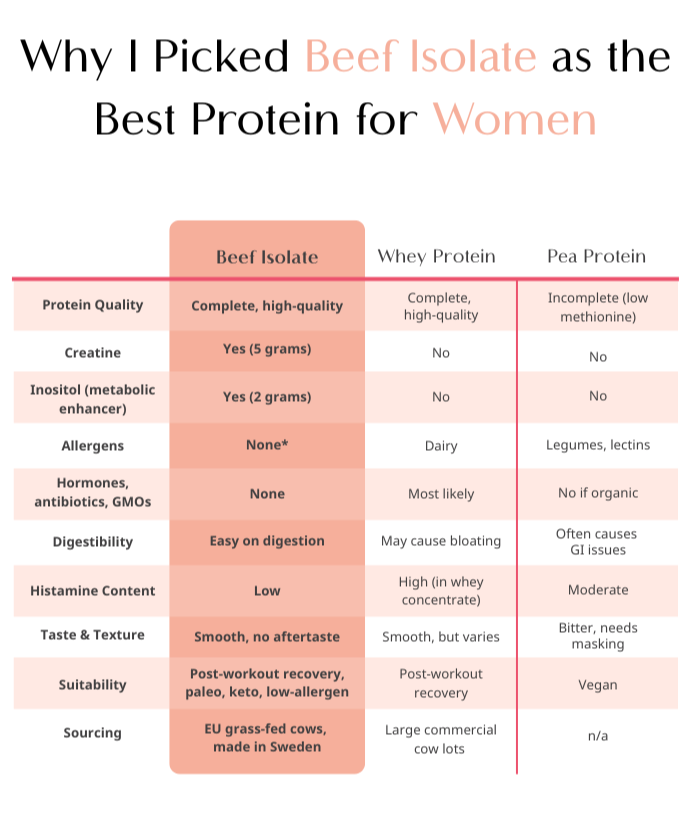 After all, I could have chosen any protein source to formulate my own – whey and pea proteins are both far cheaper than beef isolate. Yet, I chose to make Her Protein from a beef isolate in order to deliver a hypoallergenic solution more women could consume.