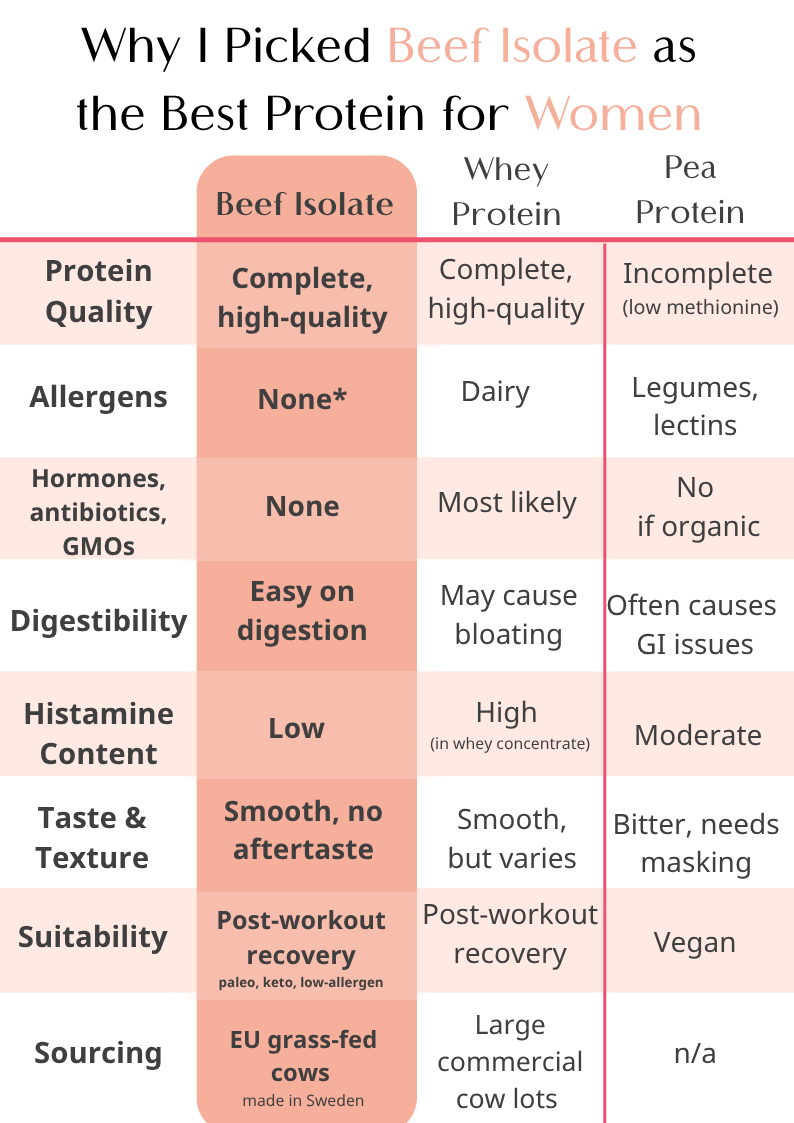 After all, I could have chosen any protein source to formulate my own – whey and pea proteins are both far cheaper than beef isolate. Yet, I chose to make Her Protein from a beef isolate in order to deliver a hypoallergenic solution more women could consume.