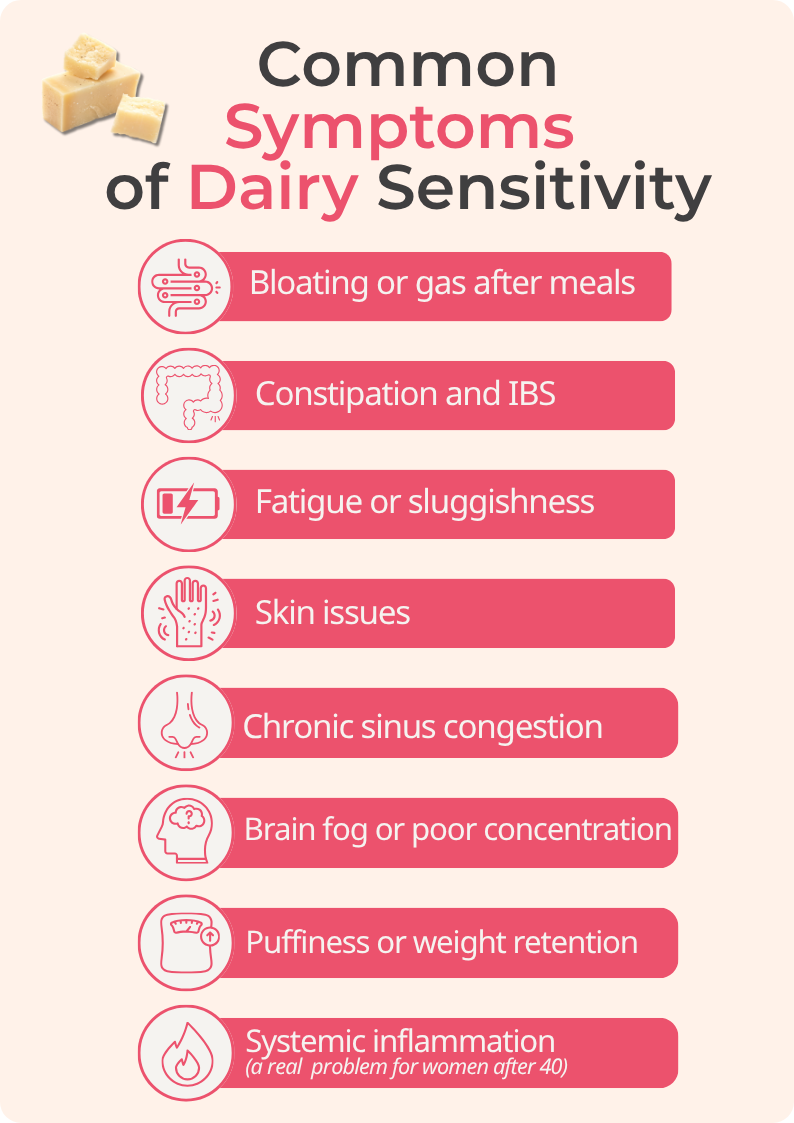 In fact, according to the National Institutes of Health, around 65% of people worldwide have a reduced ability to digest lactose after infancy [NIH, Lactose Intolerance, 2020]. Even among those who aren’t officially lactose intolerant, dairy sensitivity can trigger a wide range of subtle and chronic symptoms, especially in women over 40.